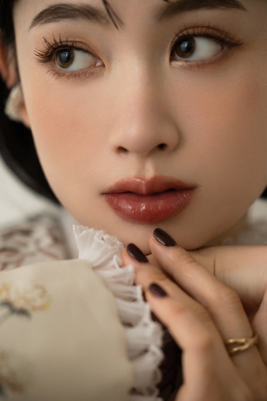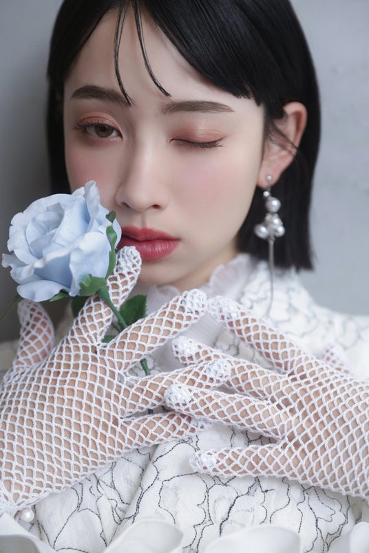 ヘアメイクはツヤっとしたブルーピンクで透明度アップ。