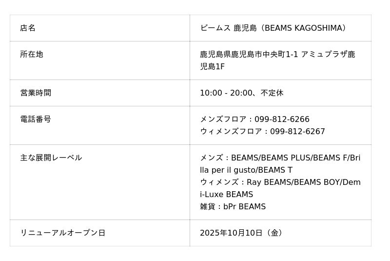 株式会社ビームス(本社:東京都渋谷区、代表取締役社長:設楽洋、以下ビームス)は、2025年10月10日(金)に「ビームス 鹿児島」(鹿児島県鹿児島市)を、リニューアルオープンすることを発表します。