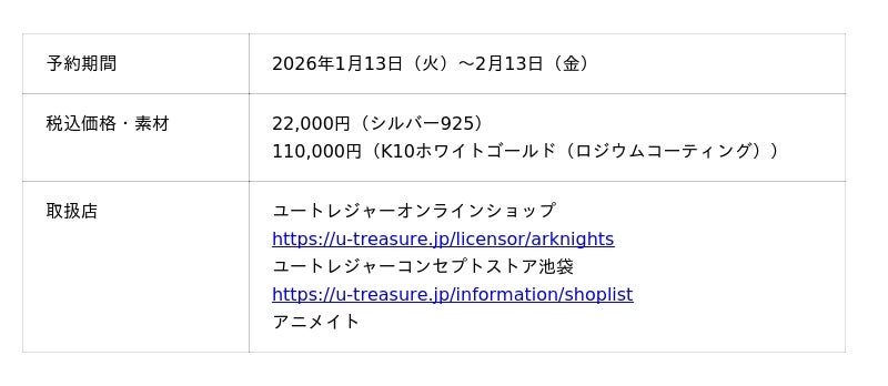 株式会社ユートレジャー(本社:東京都新宿区、代表取締役社長:青木 興一、株式会社ケイ・ウノの連結子会社)は、スマートフォン向けゲームアプリ「アークナイツ」とのコラボレーションした「モチーフネックレス」の第9弾「血掟テキサス」「聖約イグゼキュター」「濁心スカジ」全3種類の予約受け付けを、2026年1月13日(火)~2月13日(金)の期間、ユートレジャーオンラインショップ、ユートレジャーコンセプトストア池袋、アニメイトにて行います。
