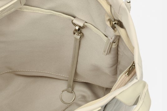 鍵やパスケースなどの小物をフックで繋げておけるキーストラップが付属。バッグ内には、複数のDカンを配置しているので、収納スタイルに合わせてお好みの位置に取り付けることができます。