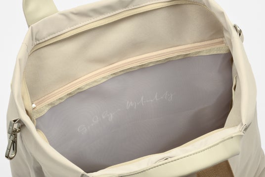 手提げとリュックの2WAY仕様で、シーンや荷物量に応じて持ち方を選べます。また、バッグ開口部の左右に設けたフックを留めることで、シルエットのアレンジが可能です。荷物が少ない時はすっきりとしたスマートなフォルムに、荷物が増えた時にはゆとりのあるシルエットへと変化。荷物量やコーディネートに合わせて、その日に合った異なる表情を楽しめます。