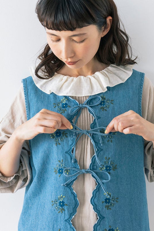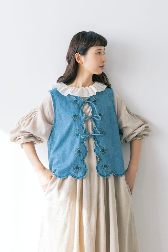 また、春ムード漂うお花刺繍のベストは、デニム素材で登場。ウェーブ状のスカラップザインを採用し、レトロ可愛いアイテムに仕上げました。素材違いでベージュのナチュラルカラーもラインアップいたしました。