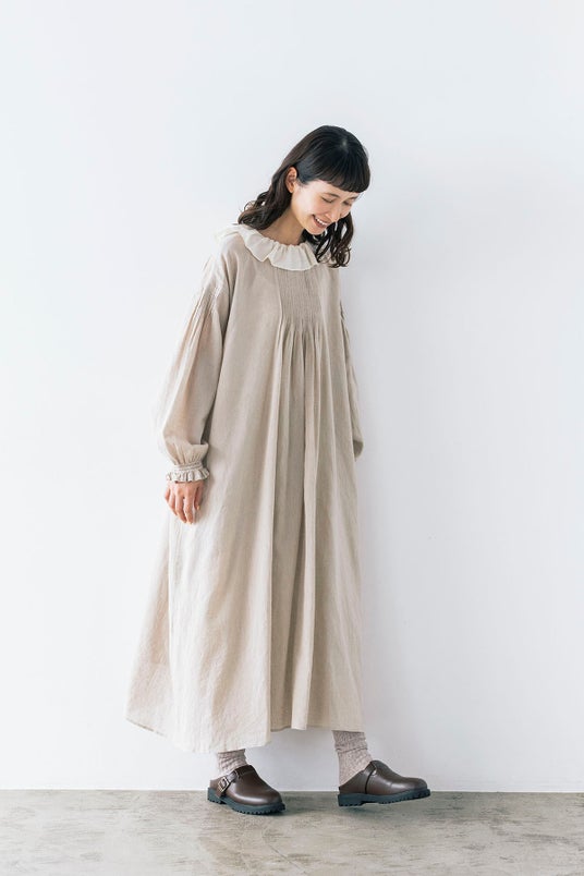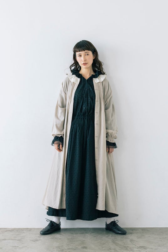 毎回大好評のワンピースは、春風に揺らめく柔らかなフレンチリネン混のコットン素材を使用。甘めなフリルと繊細なピンタックを施し、大人な甘さとヴィンテージ感を演出。前後で着用でき、前開きにすることで羽織りとしても活躍いただけるアイテムです。