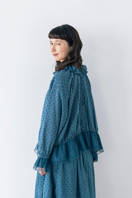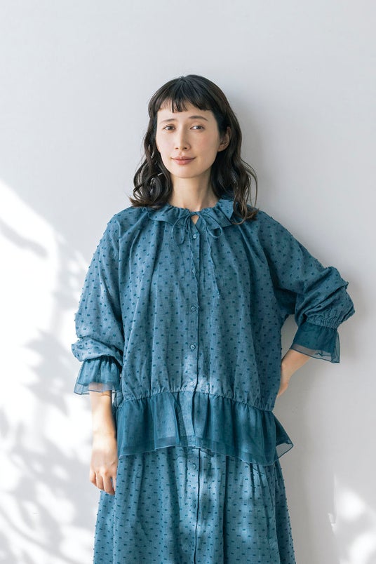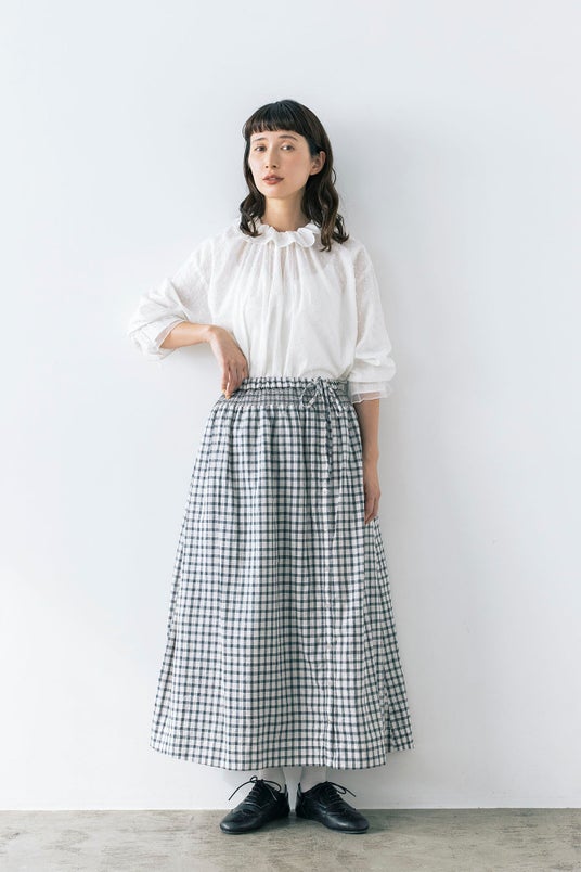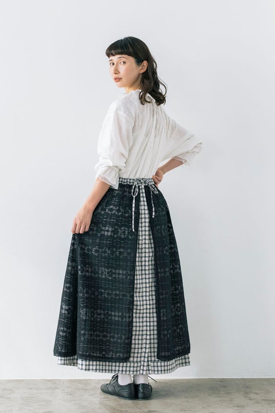 そのほか、袖口と裾にトレンドのチュール素材をふわっとまとわせたドビー生地のブラウスと、リバーシブルかつエプロンにも変化し、様々な表情でお楽しみいただけるスカートをご用意しております。