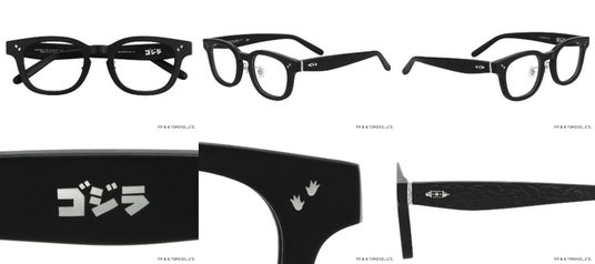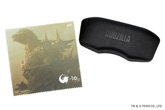 ゴジラの表皮を彷彿とさせる黒く凹凸のあるメガネケースと、各作品の象徴的なビジュアルがプリントされたメガネ拭きがセット。※各モデルに対応したメガネ拭き及びメガネケースが付属します。
