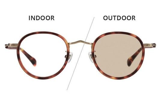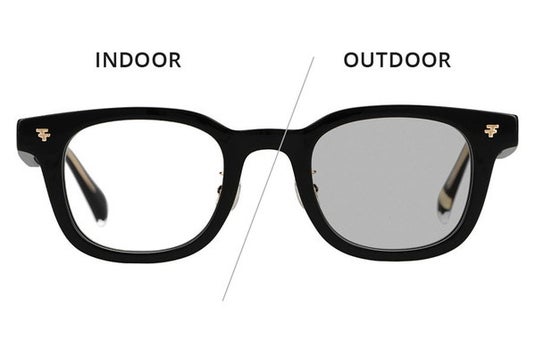 紫外線の量により、レンズの色の濃度が変化する2Way仕様。屋内ではメガネとして、屋外ではサングラスとして1本で2通りの活躍。