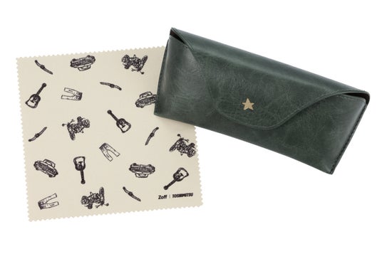 メンバーカラーの緑を採用したメガネケースと、としみつの嗜好品を本人描きおろしイラストでデザインしたメガネ拭き付き。