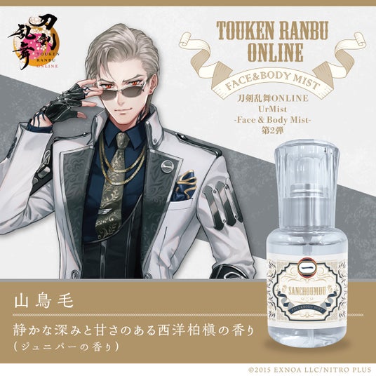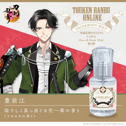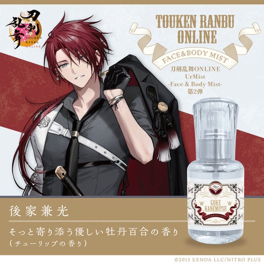 本商品は、PCブラウザ・スマホアプリゲーム「刀剣乱舞ONLINE」に登場する刀剣男士、陸奥守吉行/山姥切国広/豊前江/山鳥毛/後家兼光の5振りをそれぞれイメージしたフェイス&ボディミスト『UrMist(ユアミスト)』です。