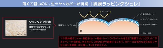 「薄膜ラッピングジュレ」がネットワークを形成し肌に密着。カバー力がありながらも生ツヤ仕上がりを持続!