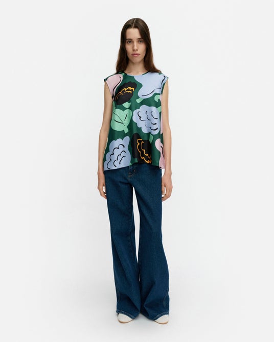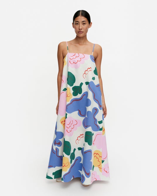 本コレクションでは、プリントデザイナーエルヤ・ヒルヴィ(Erja Hirvi)によって2024年にデザインされた新しいプリントアイコン、「クカスタ クッカーン/花から花へ(Kukasta Kukkaan)」をフィーチャーします。夏の隠れ家で花々のインスピレーションに没頭するなか、ヒルヴィは自然の中で花が見せる多彩な表情を描き出したいという思いを込めてこのプリントを制作しました。彼女は、自然の中で花が見せる無数の表情を捉えたいと考えていました。プリント名はフィンランド語で「花から花へ」という意味で、夏の花々の間を飛び回るマルハナバチの遊び心ある動きをイメージしています。「Kukasta Kukkaan」は、今シーズンを象徴するプリントとして、贅沢なシルクのドレスやスカート、トップスをはじめ、クラシックなコットン素材のドレスやシャツなど多彩なアイテムに使用されています。