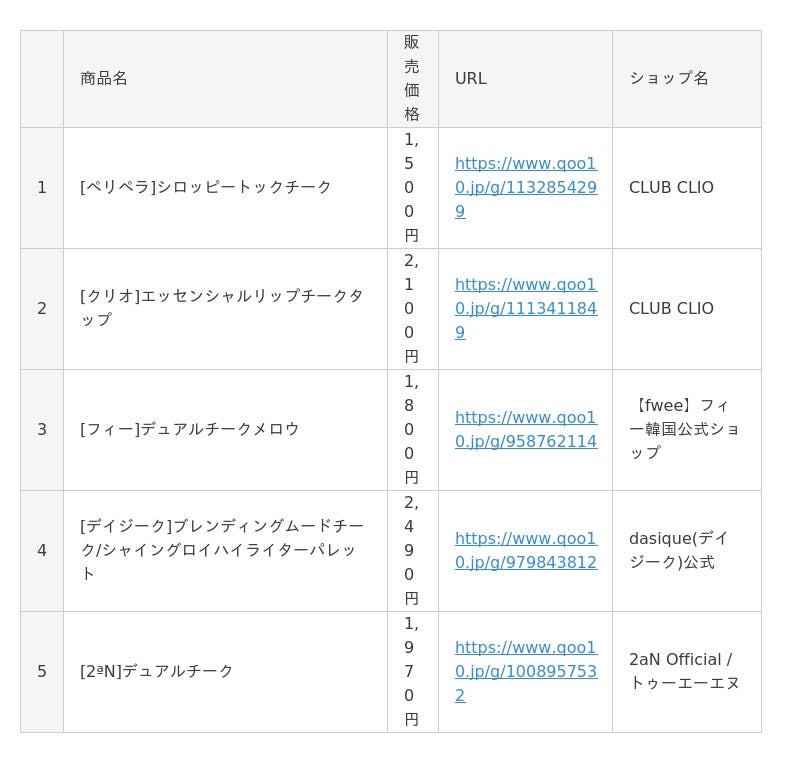 インターネット総合ショッピングモール「Qoo10」を運営するeBay Japan合同会社(本社:東京都港区、代表取締役:グ ジャヒョン)は、Qoo10で人気のコスメカテゴリーの中から、『リップ』『アイシャドウ』『チーク』と、月替わりで1アイテムをピックアップした、月間販売数TOP5※をご紹介していきます。