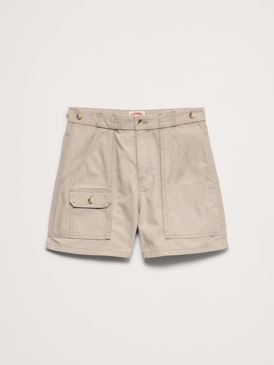 - フロントの立体的に作られたスクエアポケットやウエストのサイドに施されたベルトでサイズ調整可能なカーゴボタンショートパンツ。