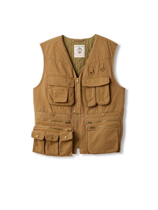- トレッキングにインスパイアされたフォトジャーナリストベストは、複数のポケットを備え裏地はキルティング生地を使用。