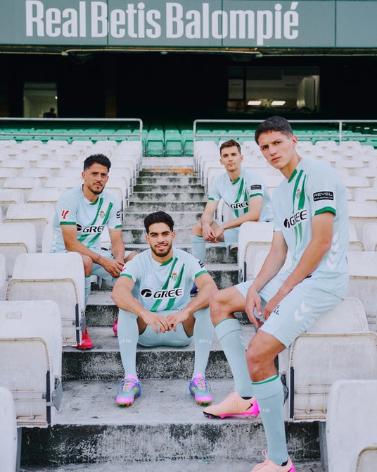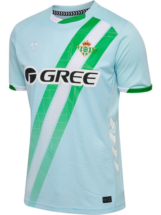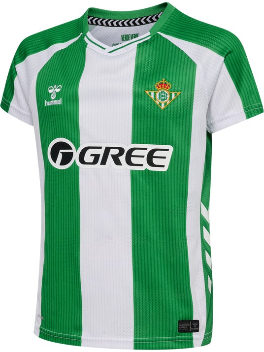 2025/26シーズンのHOMEユニフォームは、クラブを象徴する緑とホワイトのストライプ。昨シーズンより幅を広くし、クラブの個性や地元の伝統にリスペクトを込めたデザインに。襟元には、スペイン歌謡の女王として知られるマリア・ヒメネスの『Verde, Verde』 をオマージュし、“Verde, verde como el equipo de mi ciudad”(緑、緑。私の街のチームのように)のフレーズを入れ、クラブと地元文化の深い繋がりを強調しています。