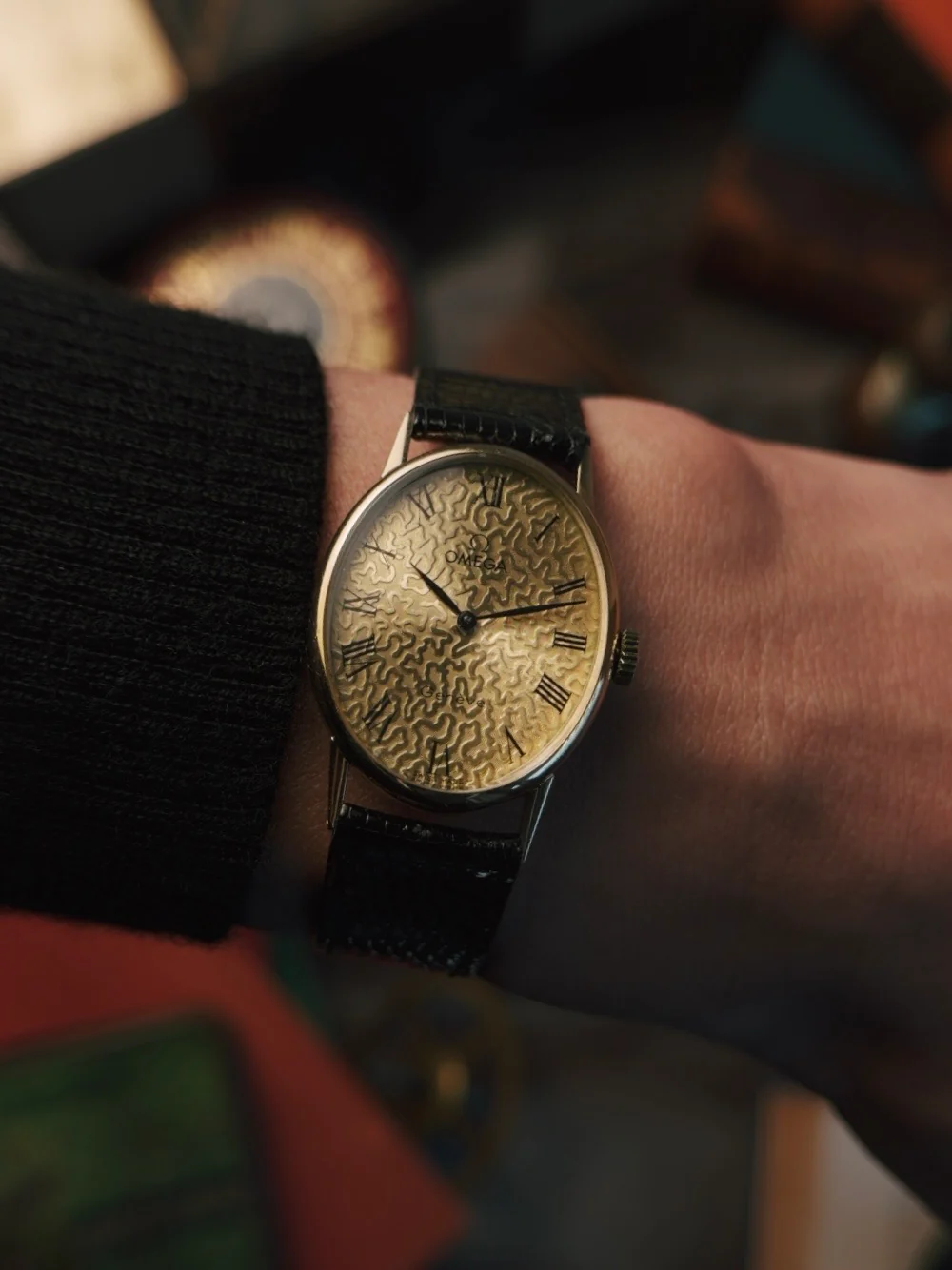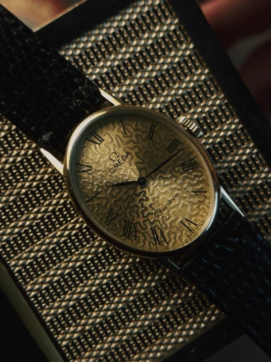 このモデルは、ローマ数字を配したテクスチャード加工のゴールドトーン文字盤、細身の針、そしてクラシックなオーバルケースが特徴です。レザーストラップとの組み合わせは、1970年代のオメガドレスウォッチに典型的な、エレガントで控えめな雰囲気を醸し出しています。
