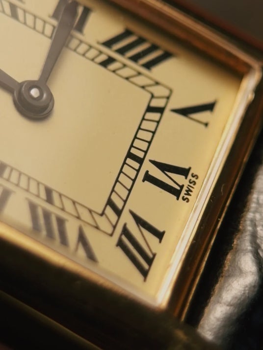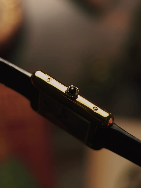 1980年代にカルティエの「マスト ドゥ カルティエ」ラインの一部として製作されたこのタンク ヴェルメイユ SMは、ゴールドプレート仕上げのスターリングシルバー製ケース、クラシックなローマ数字の文字盤に「マスト ドゥ カルティエ」の刻印、シュマン・ド・フェール(分目盛り)、そしてブルーのカボションカットのリューズが特徴です。不朽の名作タンクデザインを、洗練された形で表現しています。