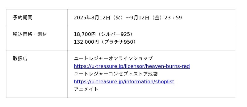 『ヘブンバーンズレッド』とコラボレーションした、「メモリアルネックレス」も同期間中(2025年8月12日(火)~9月12日(金))予約を受け付けております。