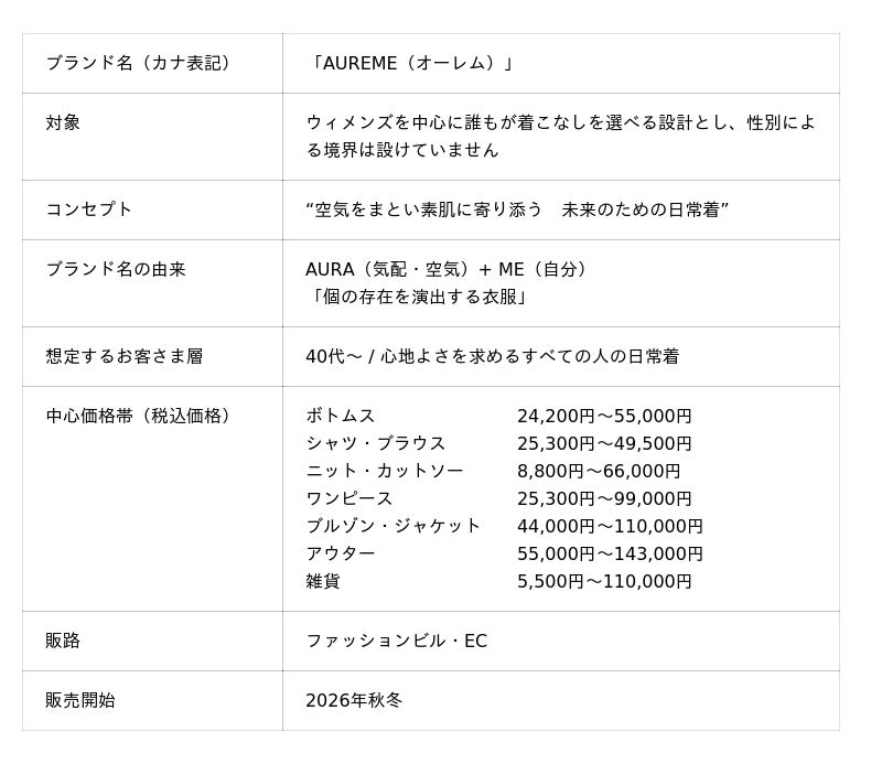 三陽商会は、中期経営計画(2026年2月期~2028年2月期)における新たな成長戦略の一環として、ファッションビル展開強化に向けた新ブランド「AUREME(オーレム)」の展開を2026年秋冬シーズンより開始します。