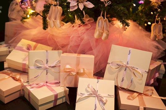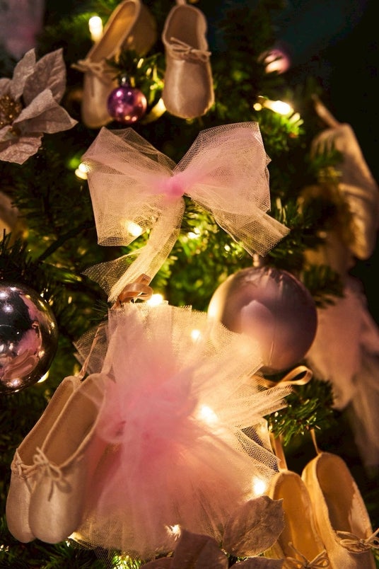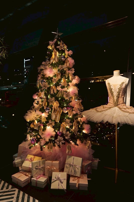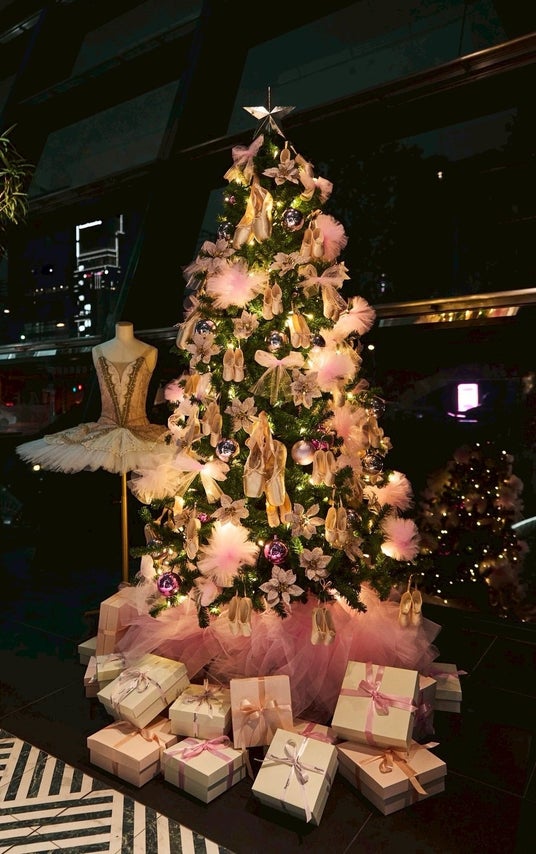 ホテルロビーに登場するクリスマスツリーは、レペットの象徴であるトゥシューズのミニチュアオーナメントをはじめ、本物のトゥシューズ、ピンクのボールやサテンリボンを取り入れ、華やかでロマンティックな雰囲気を演出。さらに、ツリーの足元には、チュールの装飾とプレゼントボックスが並び、まるでバレリーナが身にまとうチュチュのようなイメージを再現しております。