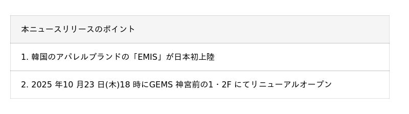野村不動産コマース株式会社(東京都港区/代表取締役社長:鵜沼孝之)は、GEMS 神宮前1,2 階区画において韓国のアパレルブランド「EMIS」が10 月23 日に開業することをお知らせいたします。「EMIS」は日本での常設店舗、及びフラッグシップストアとしての出店は今回初めてとなります。