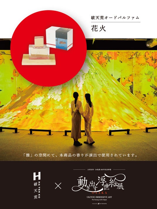 この度、『動き出す浮世絵展 OSAKA』にて、株式会社キャライノベイトが手掛ける香水ブランド『破天荒』とコラボレーションした展示の開催が決定しました。既存の枠にとらわれない発想と挑戦の象徴である『破天荒』の香りの演出と、『動き出す浮世絵展』の最先端の映像技術によって彩られるイマーシブ展示の融合は、来場者の五感を刺激し、これまでにない新しい没入体験を創出します。
