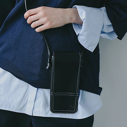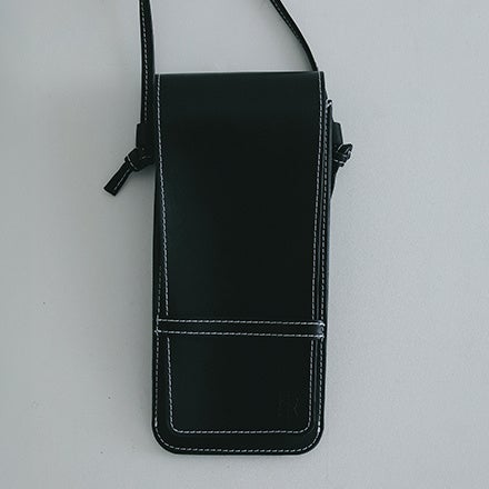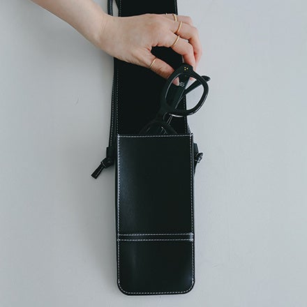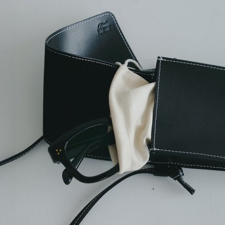 持ち運びに便利なショルダータイプのメガネケースと、メガネ拭き素材のポーチがセットに。