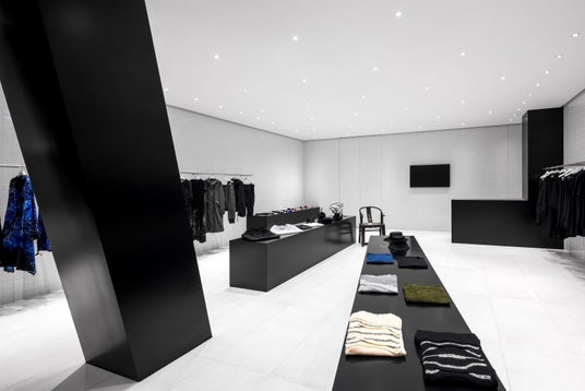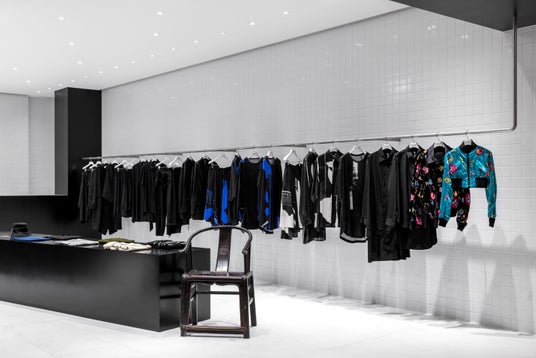 新店舗のデザインは、南台湾の造船業や製鉄業に代表される大規模な生産・建設文化から着想を得ています。店内中央には、重厚なグレイッシュブラックの金属で構成され非対称に傾いた柱を配置。真っ白なタイル壁とのコントラストが、象徴的な存在感を放ちます。異素材の組み合わせやスケールの大胆さによって空間に奥行きと立体感を生み出し、Ground Yのフィロソフィーを表現しています。