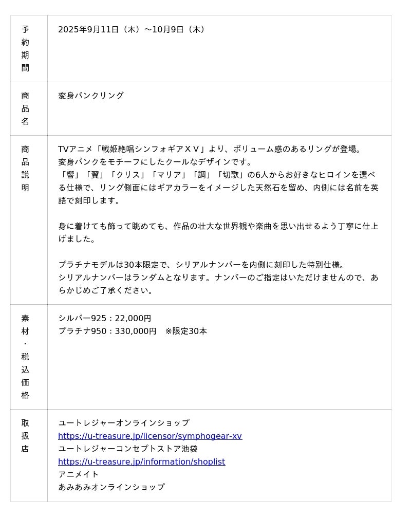 株式会社ユートレジャー(本社:東京都新宿区、代表取締役社長:青木 興一、株式会社ケイ・ウノの連結子会社)は、TVアニメ「戦姫絶唱シンフォギアXV」とのコラボレーションアイテム「変身バンクリング」の予約受付を2025年9月11日(木)~10月9日(木)の期間、ユートレジャーオンラインショップ、ユートレジャーコンセプトストア池袋にて行います。プラチナver.は限定30本のシリアルナンバー入りです。