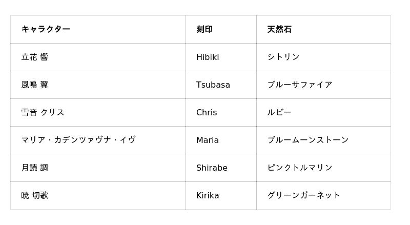 このたびの新作は、TVアニメ「戦姫絶唱シンフォギアXV」の変身バンクをモチーフにしたデザインのリング(指輪)です。6人それぞれのギアカラーをイメージした天然石を留め、名前を英語で刻印しました。