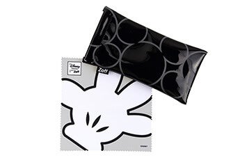 全てのフレームに、ミッキーフェイスのシルエットデザインのメガネケースと、ミッキーの手を大胆にプリントしたメガネ拭きが付きます。