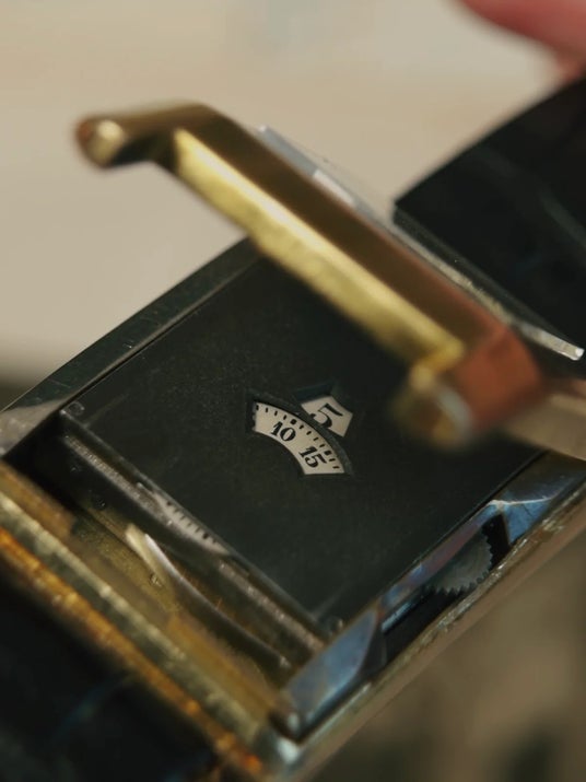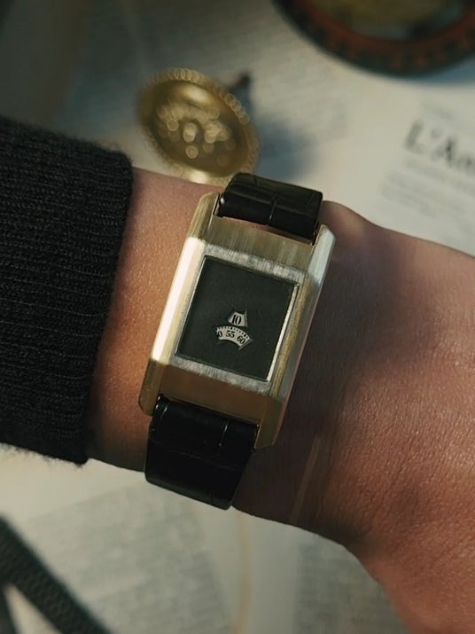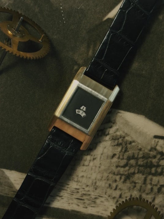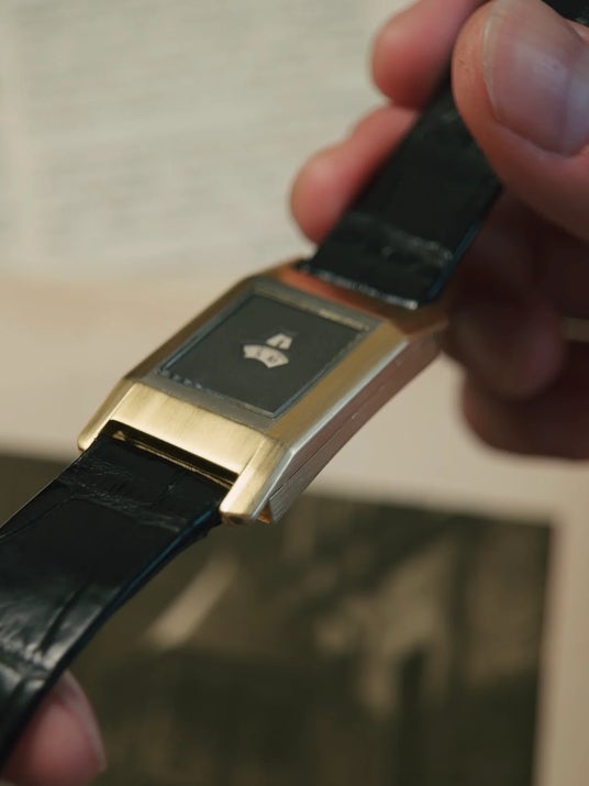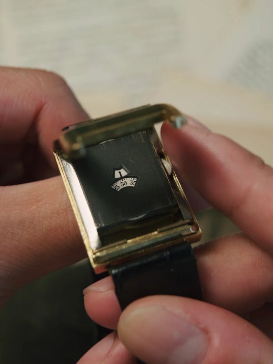 約30mm × 45mmの当時としては異例とも言える18金無垢のレクタンギュラーケースには、ジャンピングアワーを備えたレオン・ハートによって発明されたハートパテントの自動巻き機構が収められている希少な個体です。