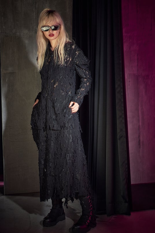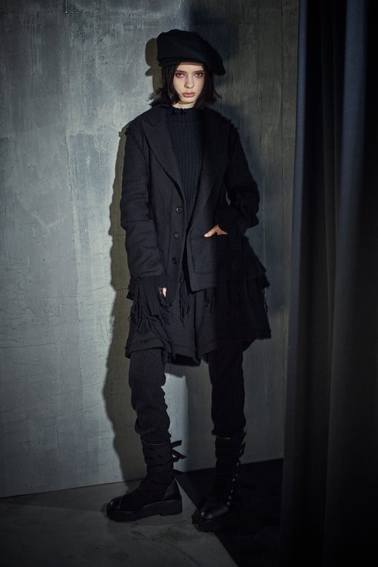 シャツカラー、肩回りが立体的にみえるフランジ・ショルダー、肩先を内側に折り込むことでショルダーラインが変化、サイドスリット、胸ポケット、基布の柔らかくエアリーなストライプ生地からフラワーモチーフのブラックレースがランダムに登場、ほつれ工程によるクラッシュテイスト、ウール