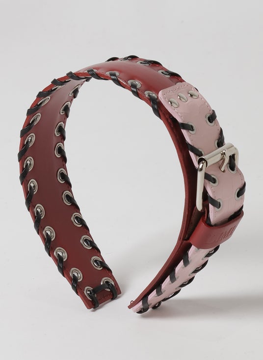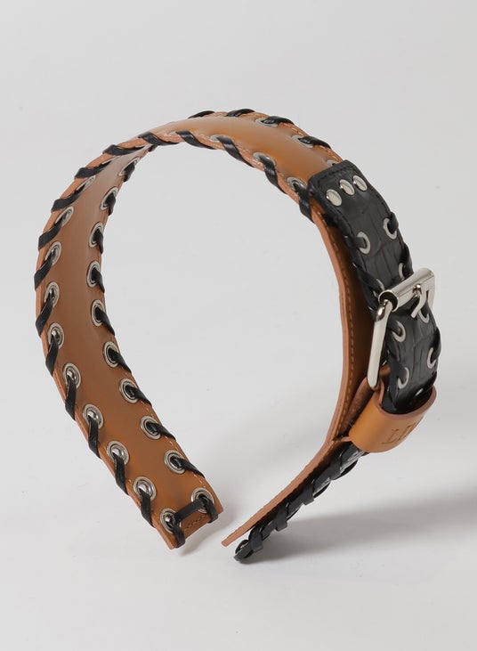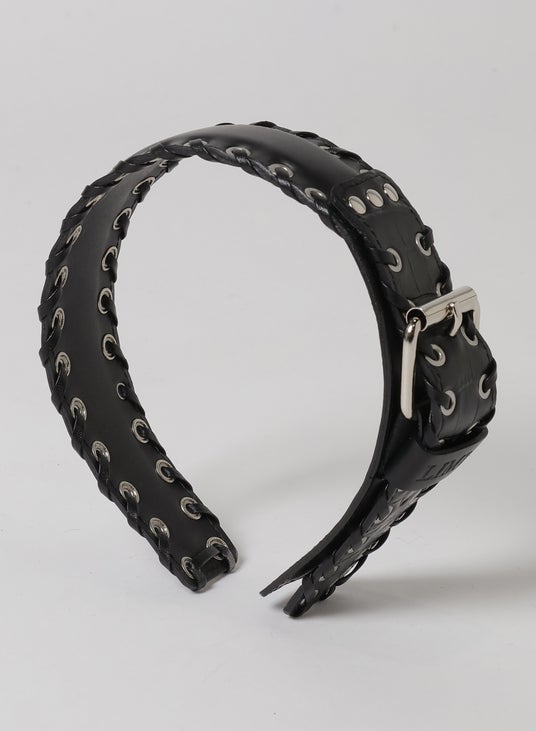 ハトメにレザーコードのあしらい、太幅カチューシャ、メタル、カウレザー