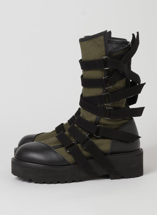 斜めカットのトゥチップと7本のベルトが特徴的なハイカットブーツ、ベルトは面テープ