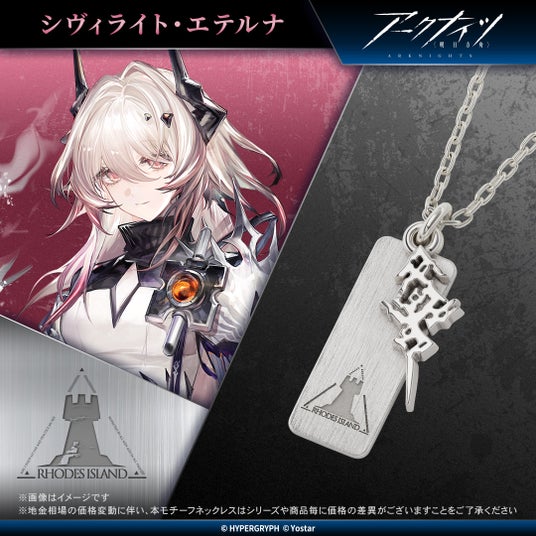 この度の新作は「アークナイツ」のオペレーター「ロゴス」は耳羽を、「ウィシャデル」「シヴィライト・エテルナ」は武器をデザインに落とし込み、所属陣営のエンブレムを刻んだプレートをセットしたネックレスです。日常使いしやすいサイズ感に仕上げました。