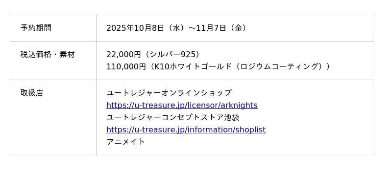 株式会社ユートレジャー(本社:東京都新宿区、代表取締役社長:青木 興一、株式会社ケイ・ウノの連結子会社)は、スマートフォン向けゲームアプリ「アークナイツ」とのコラボレーションした「モチーフネックレス」の第8弾「ロゴス」「ウィシャデル」「シヴィライト・エテルナ」全3種類の予約受け付けを、2025年10月8日(水)~11月7日(金)の期間、ユートレジャーオンラインショップ、ユートレジャーコンセプトストア池袋、アニメイトにて行います。