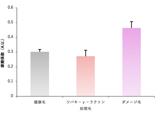 毛髪クシ通りの改善ツバキ-γ-ラクトンをダメージ毛に塗布することで、毛髪のクシ通りの良さがダメージ毛より優位に改善することが確認されました。
