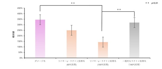 ツバキ-γ-ラクトンは一般的なラクトンと比較して同温度の熱処理だと毛髪のクシ通りを有意に改善し、60℃での低温でさらに低濃度(0.0025%)でも一般的なラクトンと同等のクシ通り改善効果を確認しました。