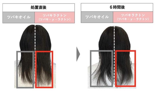 新たに発見したツバキラクトン(ツバキ-γ-ラクトン)は毛髪のキューティクルを閉じ、髪質を改善してうねりを抑えることが確認されました。また、従来の一般的なラクトンと比較して「低濃度」「低温」での効果が確認されました。ヘアアイロンによる熱の効果だけでなく、ドライヤーの熱でも効果を発揮できるのが大きな特長です。ツバキラクトン※は今後ヘアケア商品のうねり対策や髪質を整える成分の柱として活用してまいります。※ツバキ-γ-ラクトン