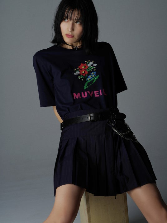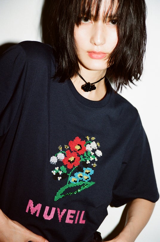 〈MUVEIL〉のアーカイブバッグに使用されていたフラワー刺繍をTシャツに落とし込みました。クロスステッチに加え、ビーズ刺繍も施された繊細かつ華やかなデザインが特徴です。サイズ感も程よくルーズに仕上げたこだわりの一枚です。