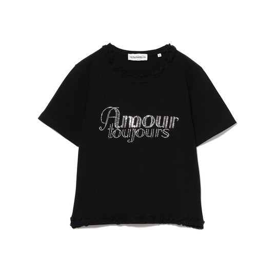 もう一方は、ブランドの中でも人気を博すミニサイズのTシャツをベースに別注。“Amour toujours(いつも愛しています。)”のメッセージを、こちらのモデルではラインストーンで表現しました。首元と裾にあしらわれたレースがロマンティックなムードを演出し、デザイナーの「愛を持って着用してほしい」という想いが込められた一枚です。