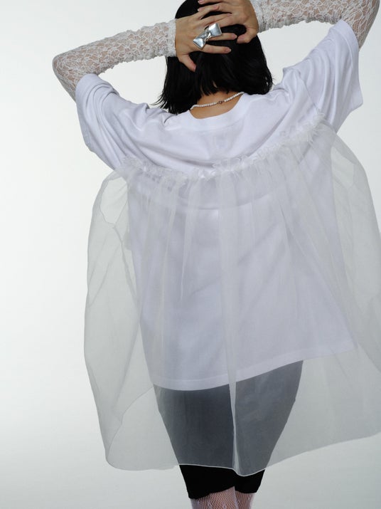 サテン地で作られたフリルを刺繍で大胆に装飾。オーガンジーとの美しいコントラストや、バックスタイルのギャザーがポイントです。ゆとりのあるシルエットで、ショートワンピースとしても着用可能。Tシャツ部分のみをタックインし、外側のレースを見せることでレイヤード風の着こなしも楽しめます。