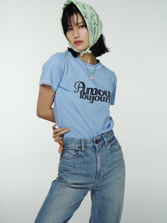 〈Carne Bollente〉で人気の配色ステッチが施されたTシャツをベースに、インラインでも使用されている“Amour toujours(いつも愛しています。)”のメッセージをプリントで表現し、ハートモチーフをラインストーンで縁取ったスペシャルなアイテム。ライトブルーの爽やかなカラーリングが魅力です。
