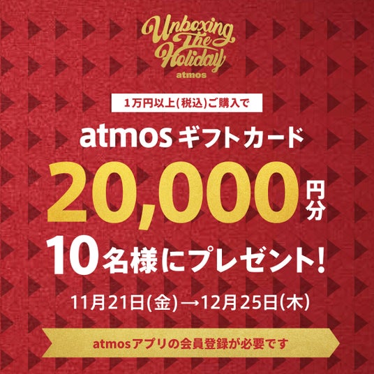 キャンペーンでは、atmosオンラインショップにてご利用いただける2万円分の”atmosギフトカード”を、atmosからのクリスマスギフトキャンペーンとして抽選でご用意しております。(一部対象外店舗がございます)
