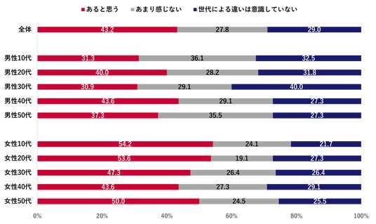 性年代別で見ると、女性は全ての年代で「あると思う」が4割を超え、男性よりも高い傾向だった。割合が最も高いのは女性10代(54.2%)、次いで女性20代(53.6%)で、それぞれ過半数を占めた。