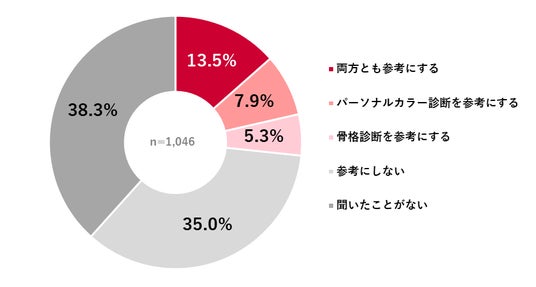 近年話題となっている「パーソナルカラー診断」や「骨格診断」について、自身の服選びに活用しているかを尋ねたところ、「両方とも参考にする」が全体の13.5%、「パーソナルカラー診断を参考にする」が7.9%、「骨格診断を参考にする」が5.3%となった。