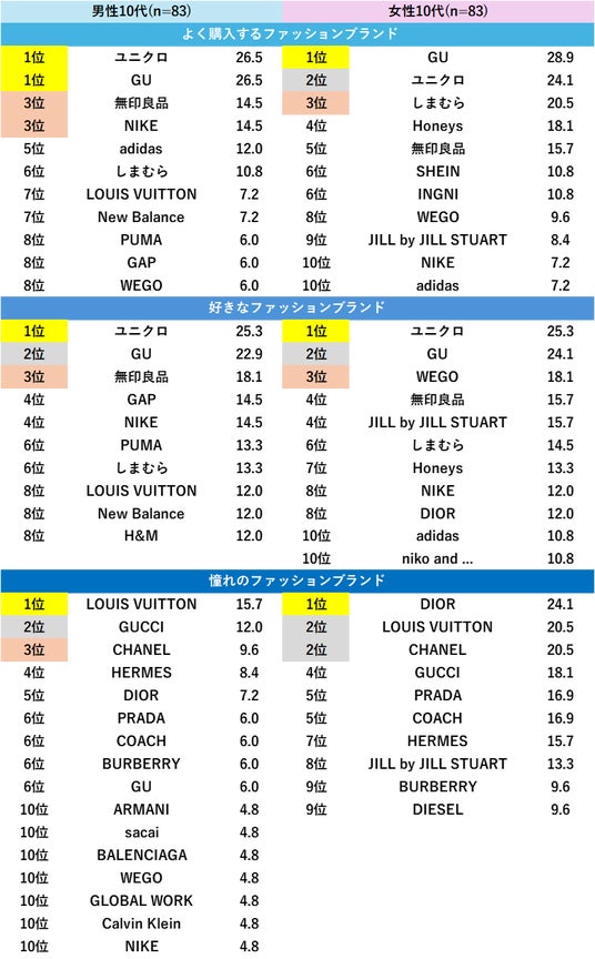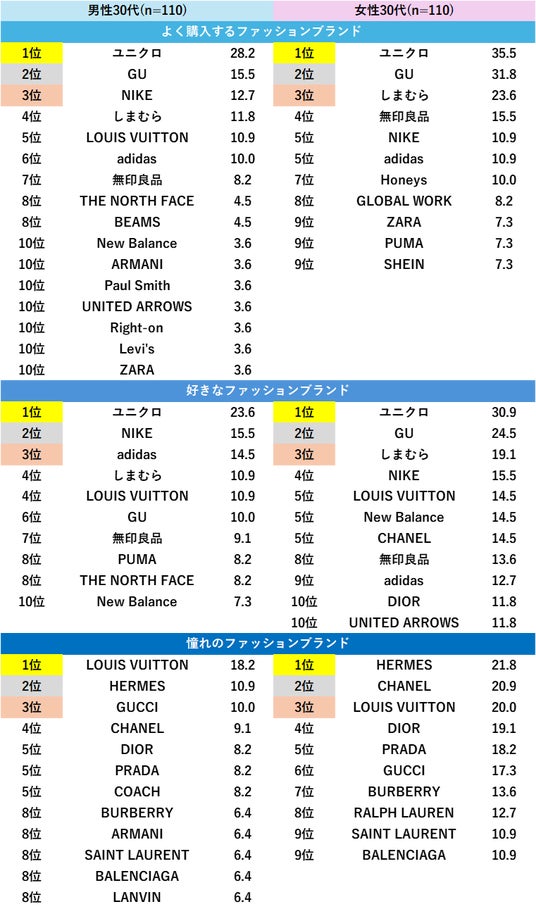 一方、「憧れのファッションブランド」ではハイブランドの名が並び、現実的な購買ブランドと理想のブランドのギャップがうかがえる結果となった。