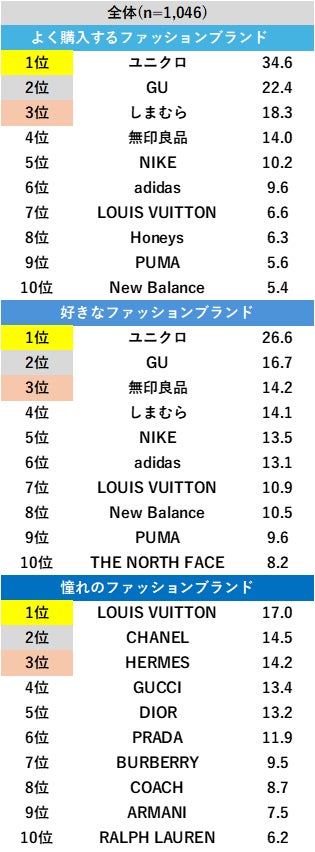 対象者に、「よく購入するファッションブランド」「好きなファッションブランド」「憧れのファッションブランド」を聴取した。「よく購入するファッションブランド」については、全体で「ユニクロ」が34.6%で1位、「GU」が22.4%で2位となった。また「好きなファッションブランド」は「ユニクロ」が26.6%で1位、「GU」が16.7%で2位となった。