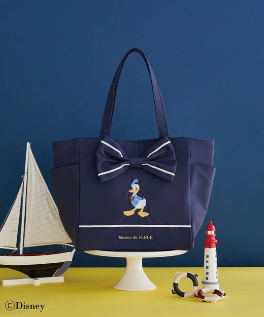 「ドナルドダック」のセーラー服をイメージしたバッグとポーチは、ネイビーをベースにホワイトのラインテープとリボンがポイント。バッグには、「ドナルドダック」を優しいカラーで刺繍し、リボンポーチには、振り向き姿をゴールドで箔プリントしました。