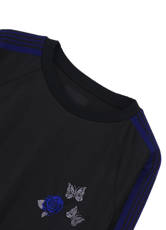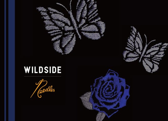 今回の新作コラボレーションでは、WILDSIDEを象徴する薔薇とNEEDLESを象徴する蝶の刺繍を大胆に配し、鮮やかなブルーをアクセントカラーにした全5型のアイテムが登場します。